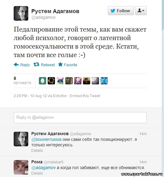 Еще один белоленточный педрило Рустем Адагамов, высказал свое мнение по поводу футбольных фанатов и их сексуальной ориентации. Напомню, ранее другой дырявый и пустоголовый уебан Илья Яшин назвал фанатов пидорасами.